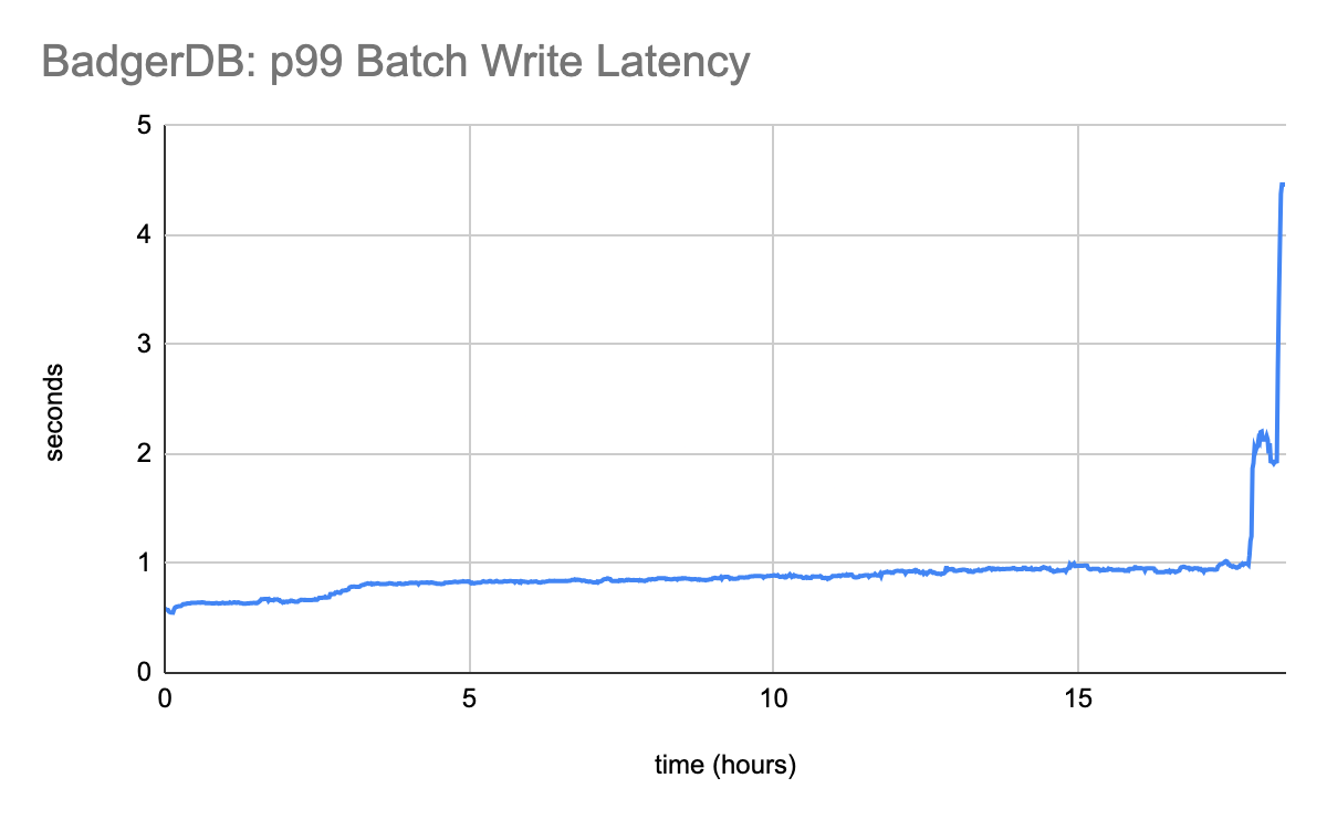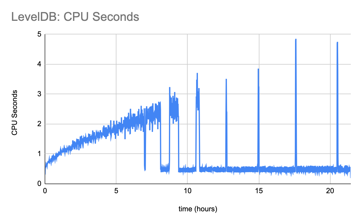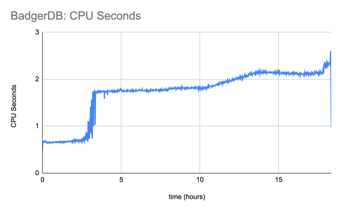 Notice the sharp spike in CPU usage at the 4 hour mark. This is when data begins expiring, and when BadgerDB’s compaction starts having work to do. As time goes on, compaction falls further and further behind, all the while eating more and more system resources.