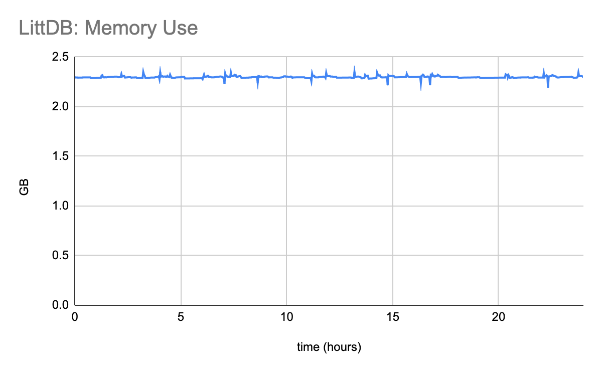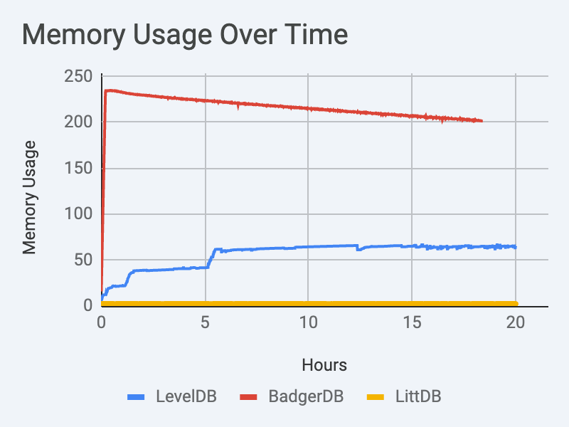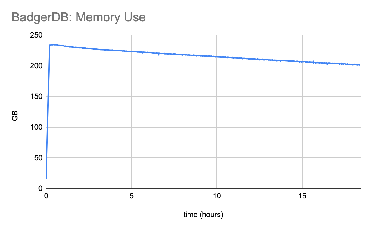 As bad as LevelDB’s memory footprint is, BadgerDB somehow manages to be much worse. The memory utilized by BadgerDB is absolutely mind blowing.
