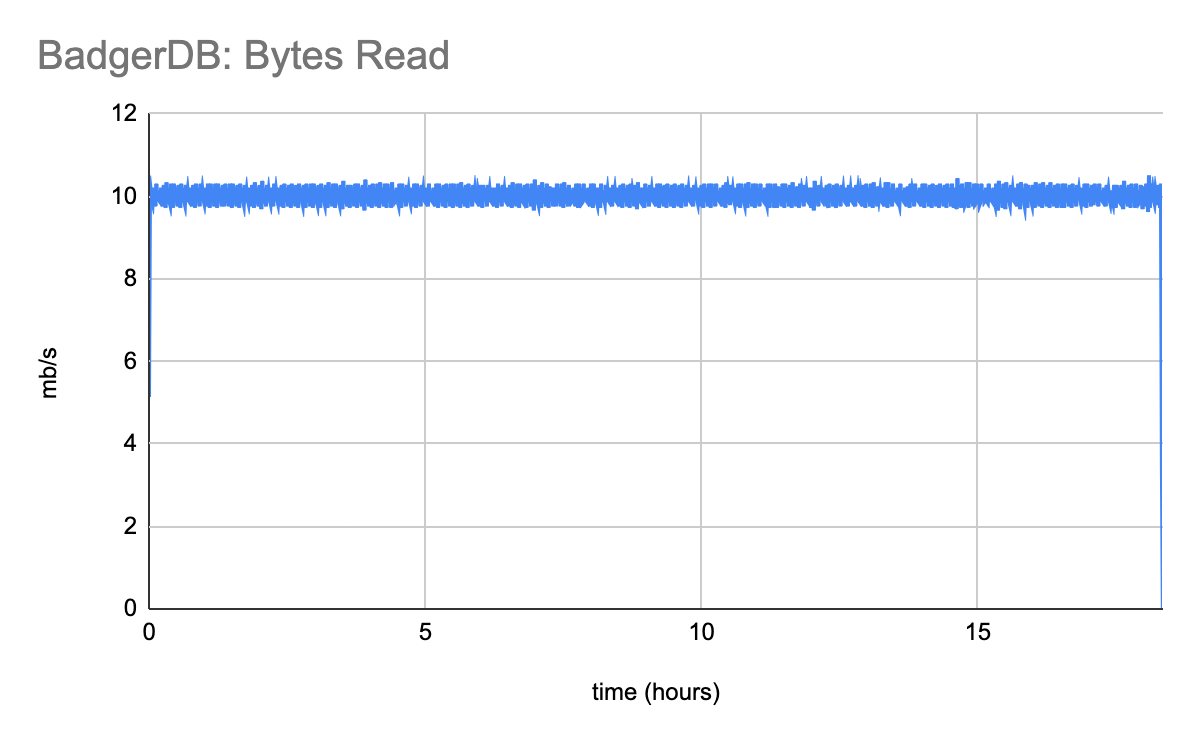 BadgerDB has no difficulty keeping up with the required 10MiB/s read traffic (at least, it doesn’t have trouble with this traffic up until the moment when it exhausted the disk and crashed).