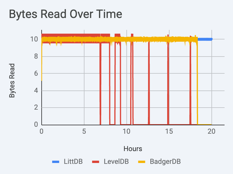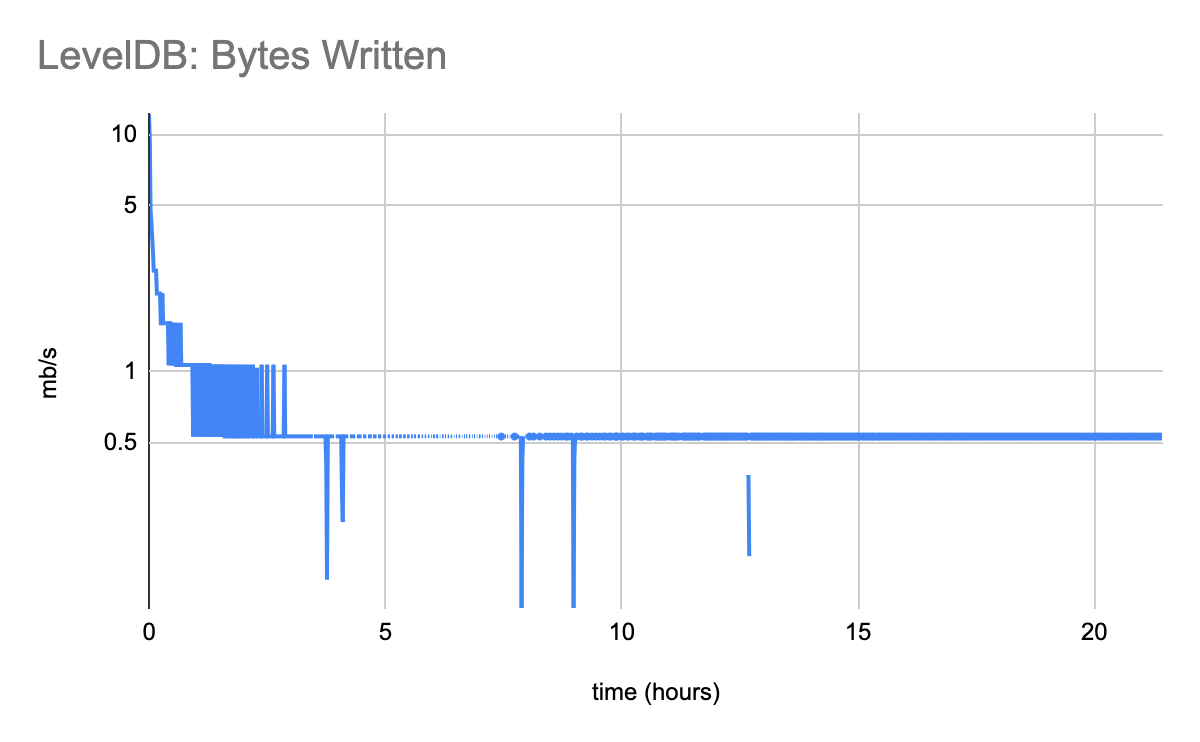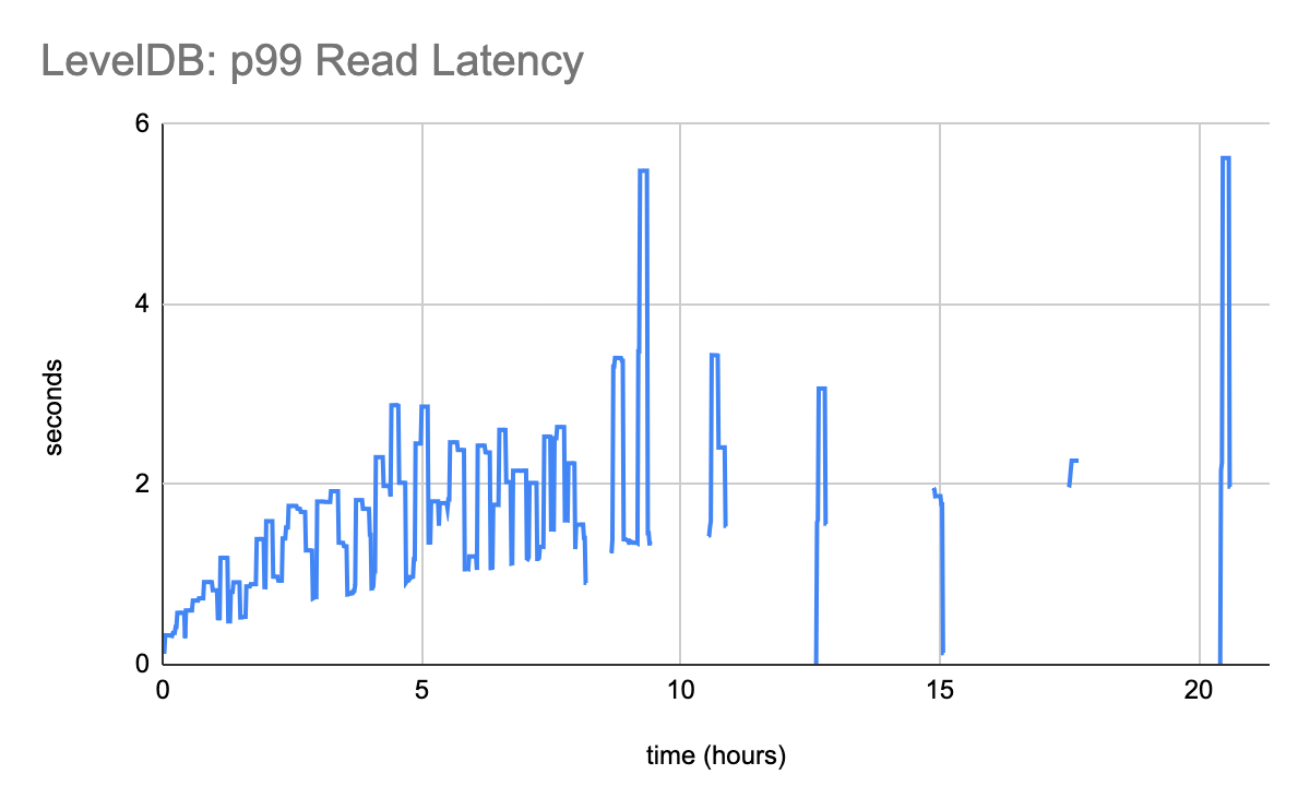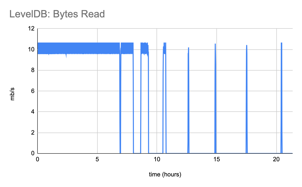 Initially, LevelDB can keep up with the required 10MiB/s read traffic. Eventually it destabilizes, going hours at a time without being capable of serving any read traffic.