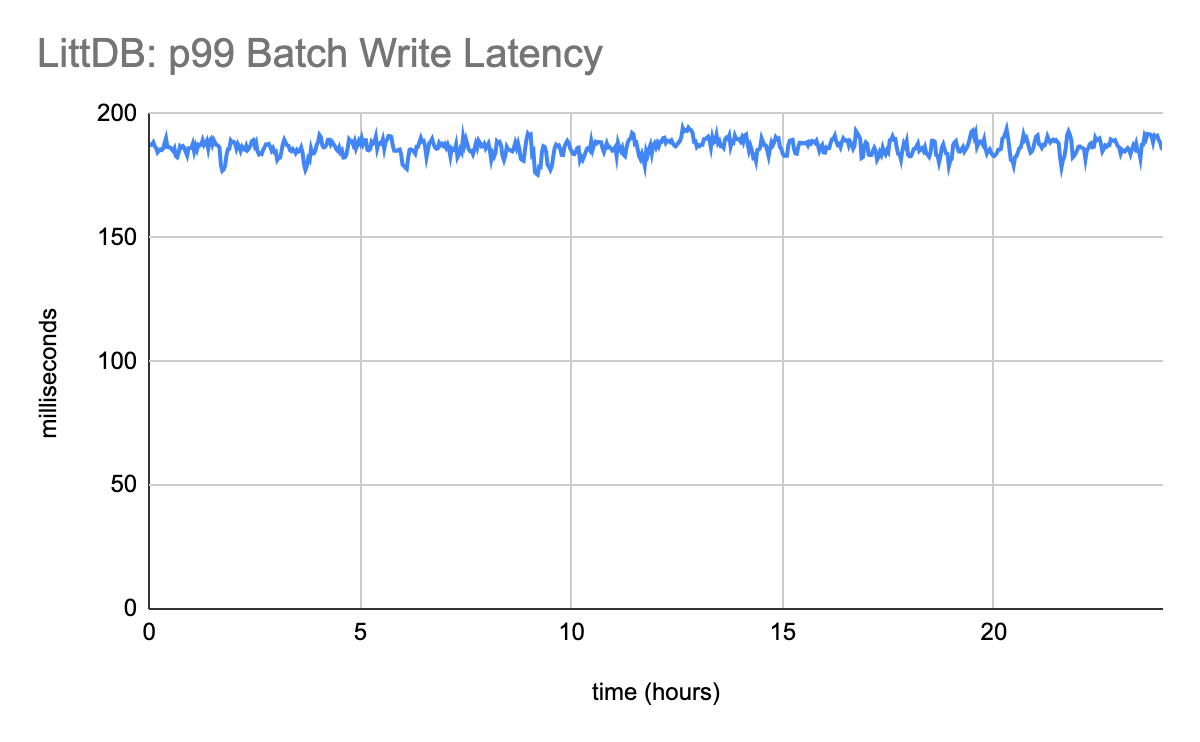 LittDB’s write latency is orders of magnitude faster than LevelDB, and approximately 4 times faster than BadgerDB. More importantly though, the write latency is stable.