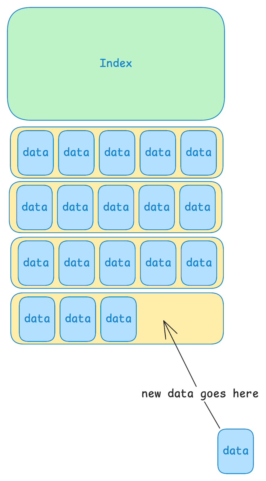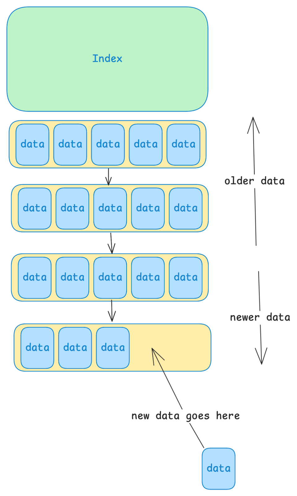 Similar to many traditional DBs, LittDB stores its data in large files, and maintains an index into those files. New data is always written to the end of the last data file. Importantly, LittDB maintains a strong ordering of its data files. Newer data always appears after older data. Data is never reordered.