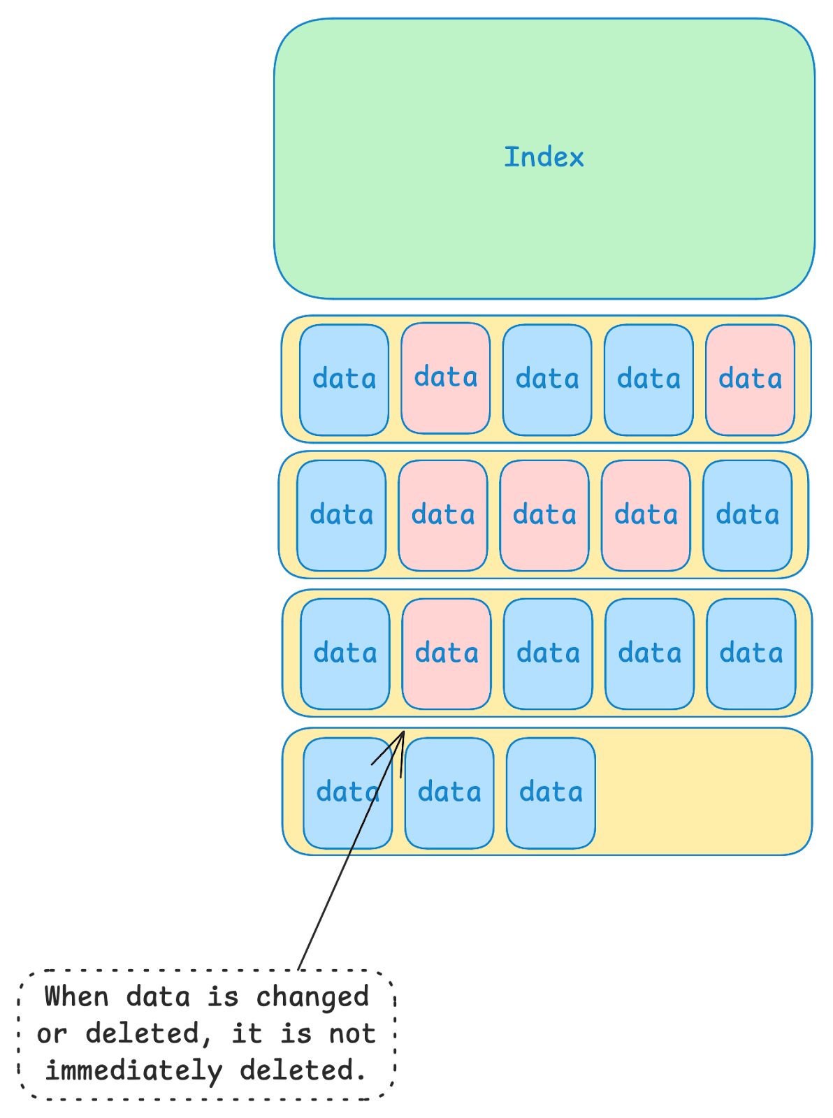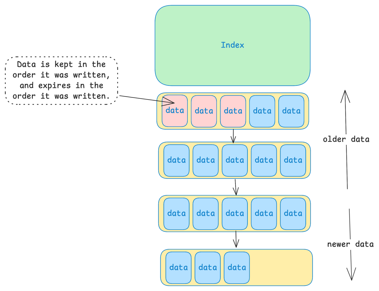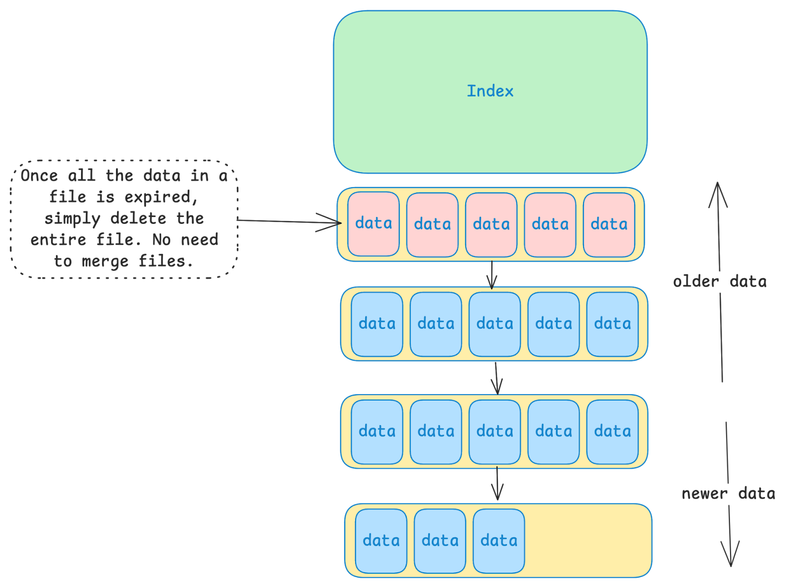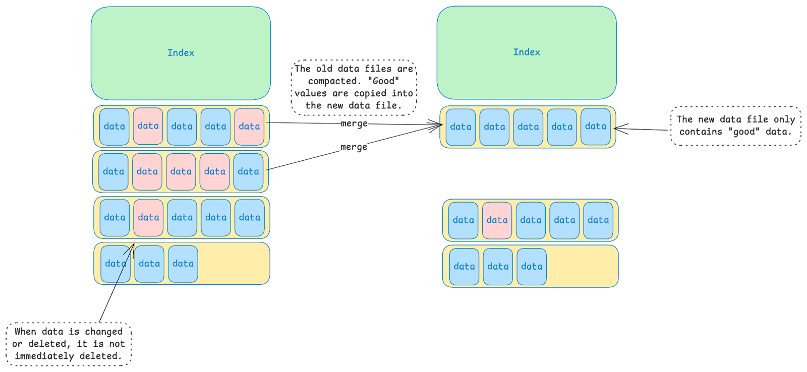 In the image above, the red boxes represent data that is “stale”. This could be because the value was modified, or because the entry was deleted, or because the entry expired due to a TTL (i.e. “Time To Live”). Since new data is always written to the end of the last data file, old values that are no longer relevant may persist for a while in old data files.