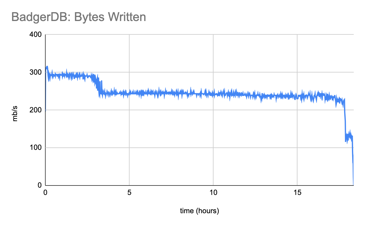 A major flaw with BadgerDB is that compaction cannot keep up with this workload. This benchmark crashed when it filled up the entirety of the 16TB disk. At 250MiB/s over a four hour data retention window, the expected disk utilization is 3.6TB. This means that at the moment BadgerDB crashed due to lack of disk space, 80% of the data on disk was eligible for immediate deletion, if only BadgerDB could delete it fast enough.