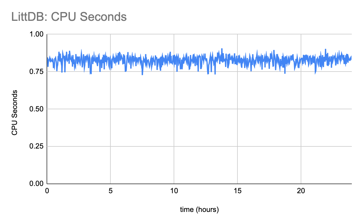 LittDB is very efficient in its use of memory. It’s important to point out that of the memory reported in the chart above, at least 1GB is being used by the benchmarking tool’s internal buffers, and is not directly related to LittDB’s use.