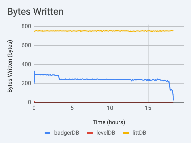 LittDB performance is highly stable at 1500x LevelDB’s write throughput, and 3x BadgerDB’s write throughput. LittDB’s performance shows no measurable difference regardless of the quantity of data stored on disk.