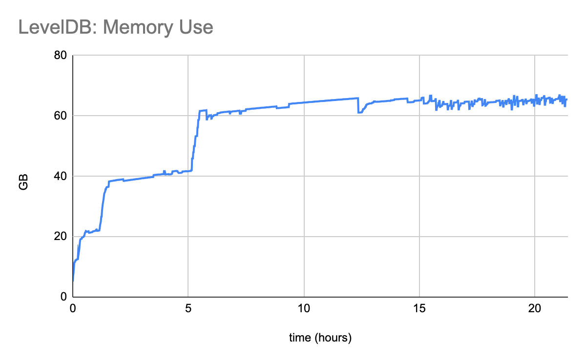 LevelDB lacks a fundamental safety mechanism: back pressure. If you push data into a database faster than the database can properly ingest, a safe system that implements proper back pressure will push back and say “Woah, that’s too fast! Wait a little while while I clear my backlog.” LevelDB does not do this. As it falls further and further behind, it gets slower and slower, while simultaneously consuming more and more memory. In extreme cases, we even observed LevelDB consuming the entirety of the host machine’s memory, leading to OOM crashes. Not small machines either – we’re talking enterprise grade servers with more than 100GB memory.