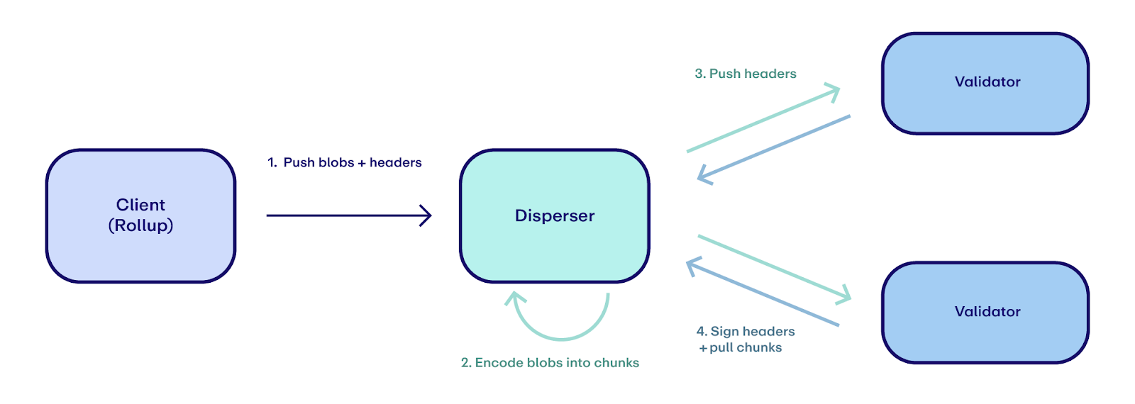 - Validator: Validators pull chunks from dispersers. They receive, verify, and sign a header attesting to the chunks, store chunks for two weeks, and serve data to others as requested.