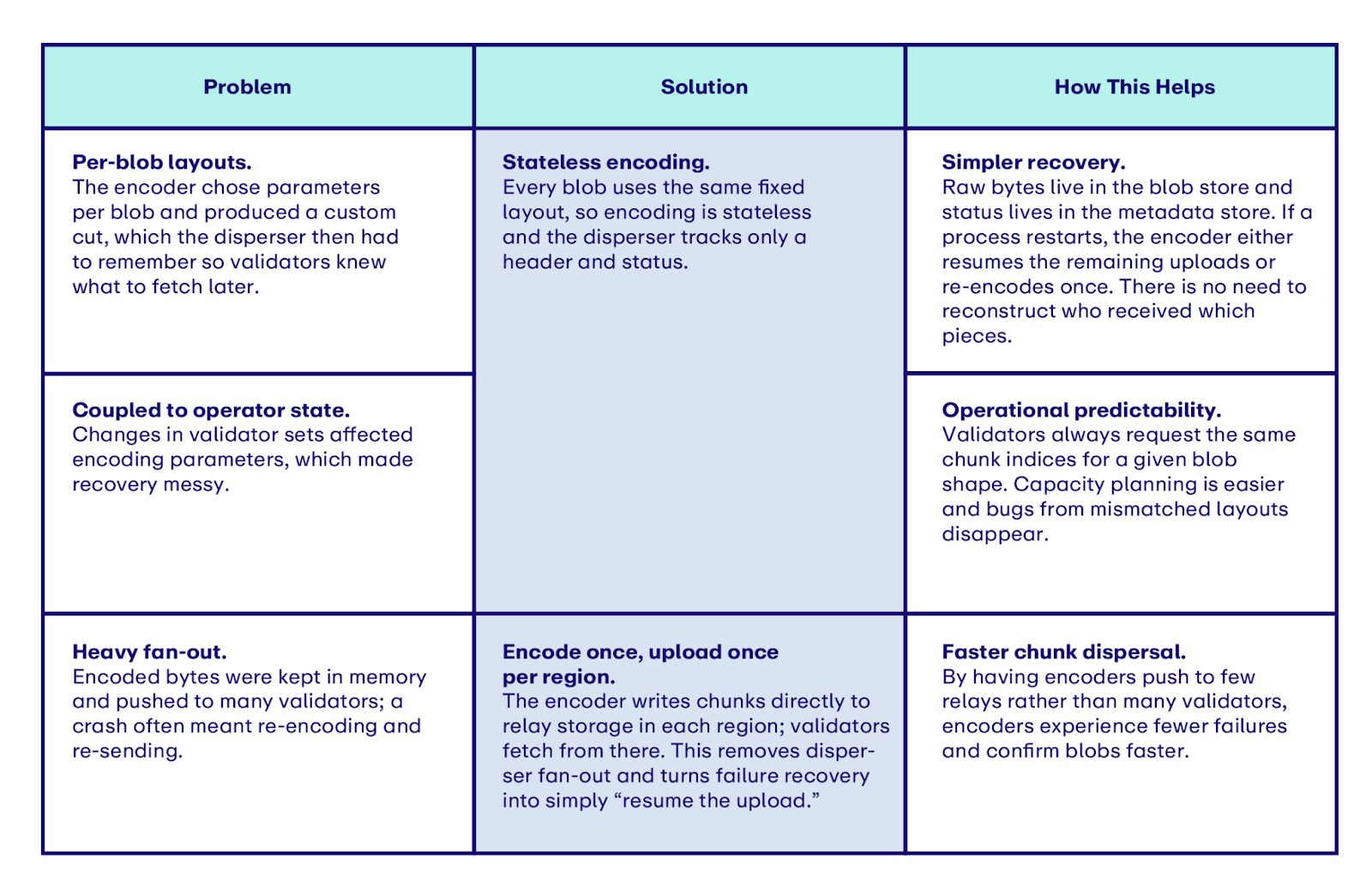 After splitting the control and data planes, the encoder became the new bottleneck. In V1, encoding depended on blob size, quorum choices, and the operator's live view of validators. Our solution? Radical simplification.