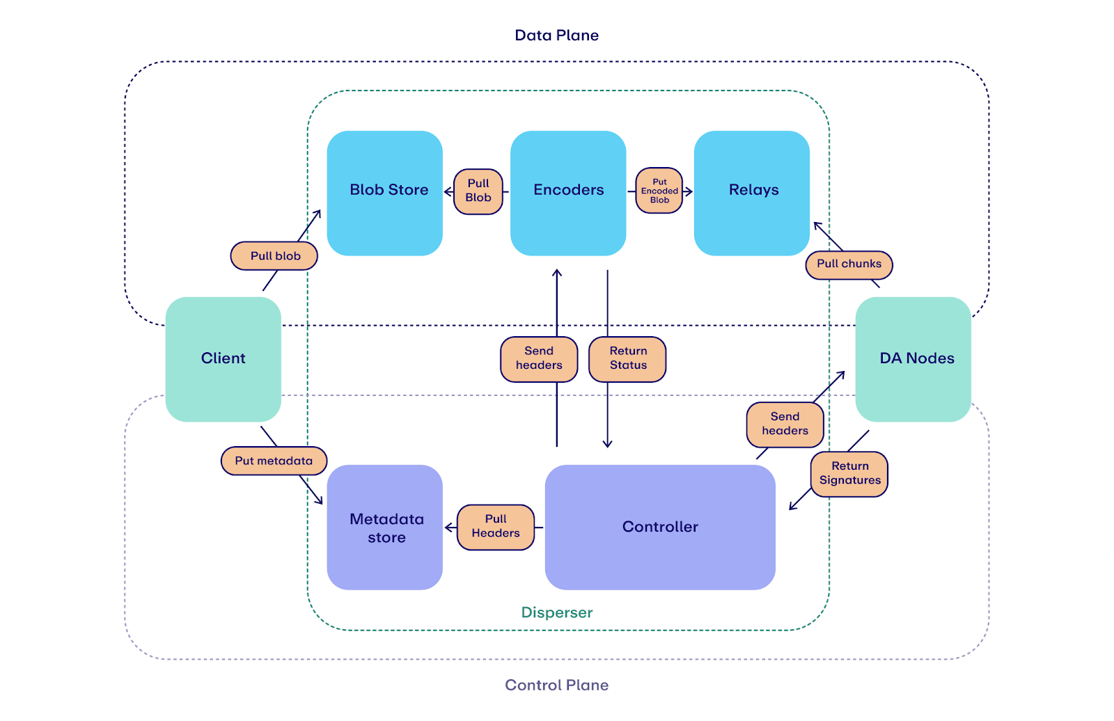 Notably, the disperser itself is a distributed system with multiple subsystems specializing in either control or data. The API server, blob store, encoders, and relays handle the data plane's heavy lifting. The metadata store and controller orchestrate the control plane's coordination logic.