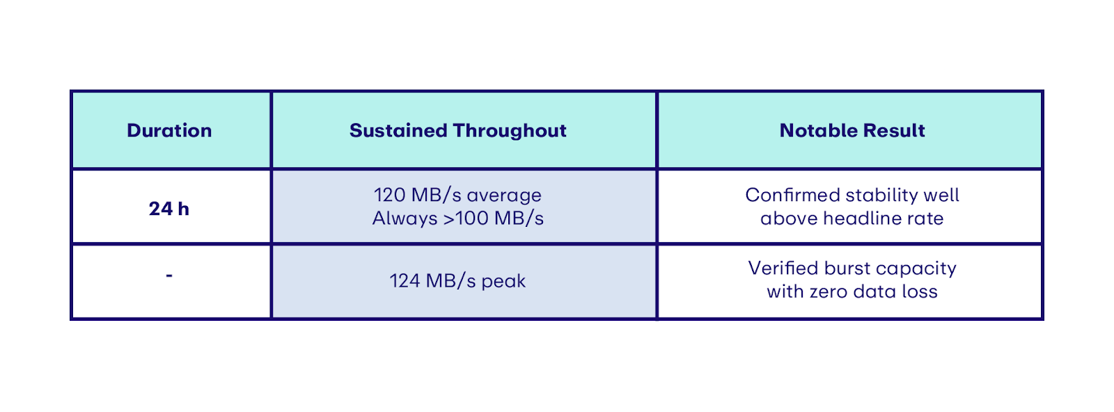 We proved this under near-mainnet conditions: we split stake across 14 independently run validators on Holesky, spread across North America, Europe, and Asia. Over 60+ continuous hours of load testing, EigenDA not only sustained its headline throughput but repeatedly exceeded it.