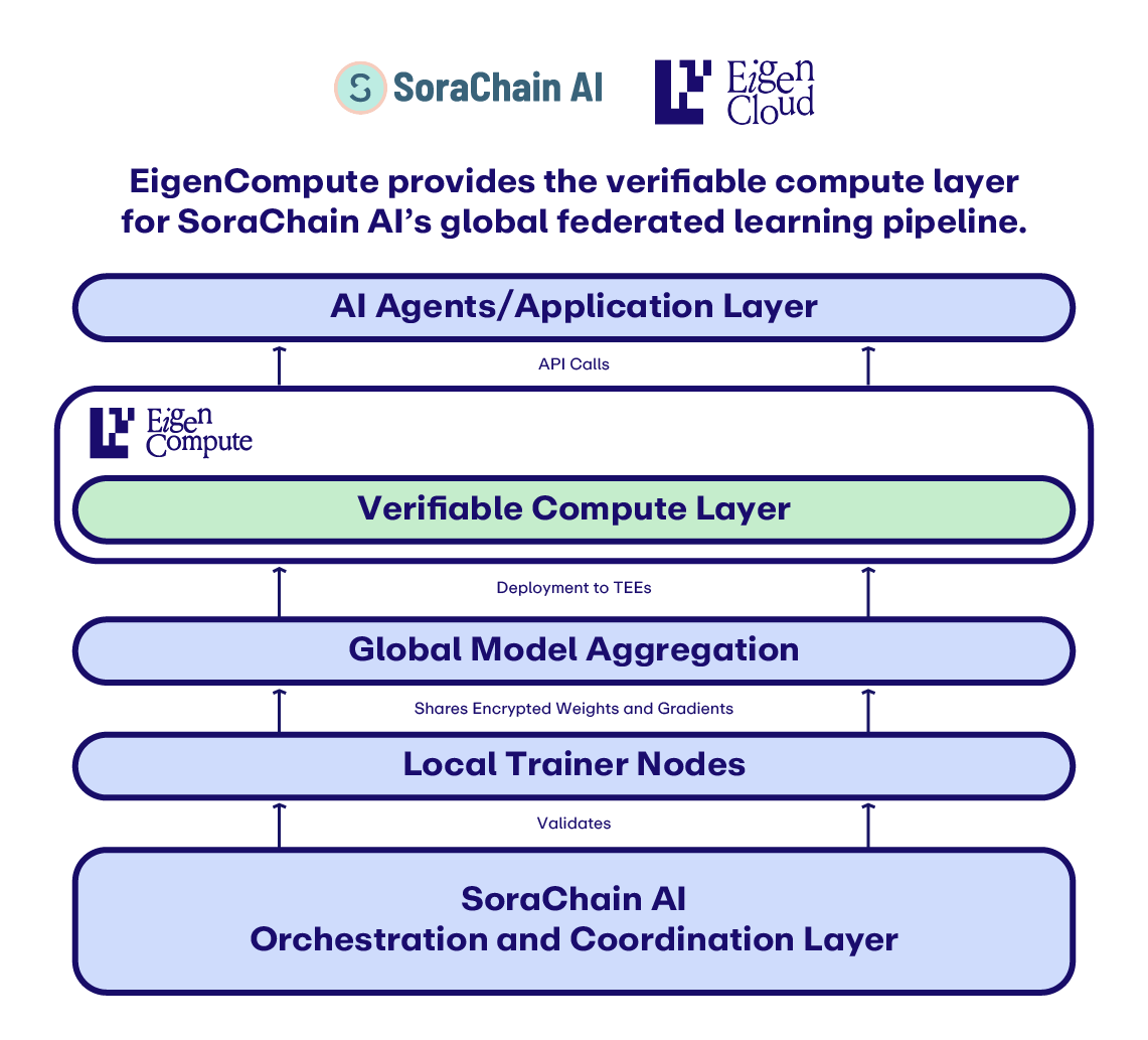EigenCompute and SoraChain AI built verifiable global-scale federated learning infrastructure – what the industry needed but couldn't build alone. Their combined stack lets partners train models across borders without sacrificing privacy, compliance, or trust.