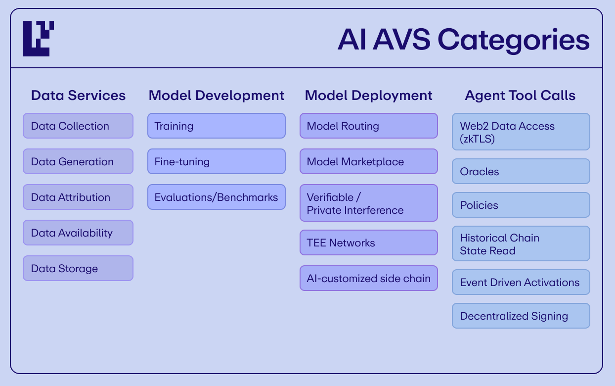 While this post focuses on Level 1 Agents and how AVSs enable verifiable tool calling, AVSs also enable verifiability across the rest of the AI stack, as non-exhaustively shown above, a topic we’ll dive into in a follow-up post.