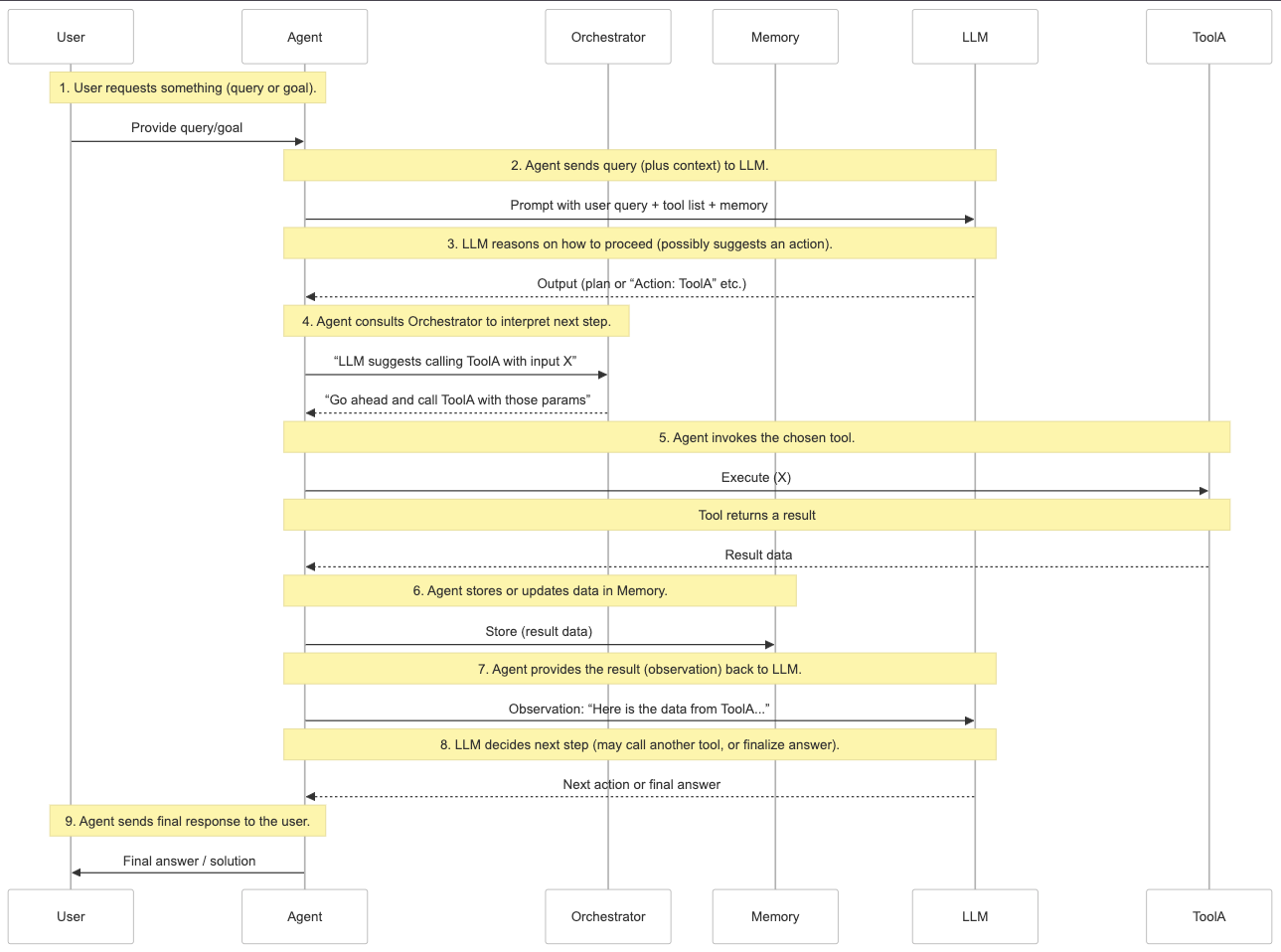 - Iterative Loop: The agent can call multiple tools in sequence before reaching a final answer, repeating steps 2–9 as needed.