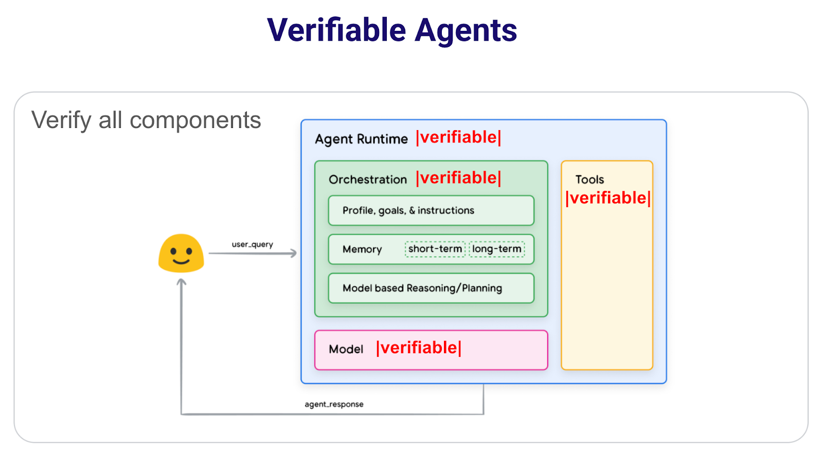 Just as we covered agent architecture above, if we were to have the agent take on the properties of an onchain environment, we’d say the agent is verifiable. As such, each component of the architecture would need to be then verifiable, which would give us the following diagram: