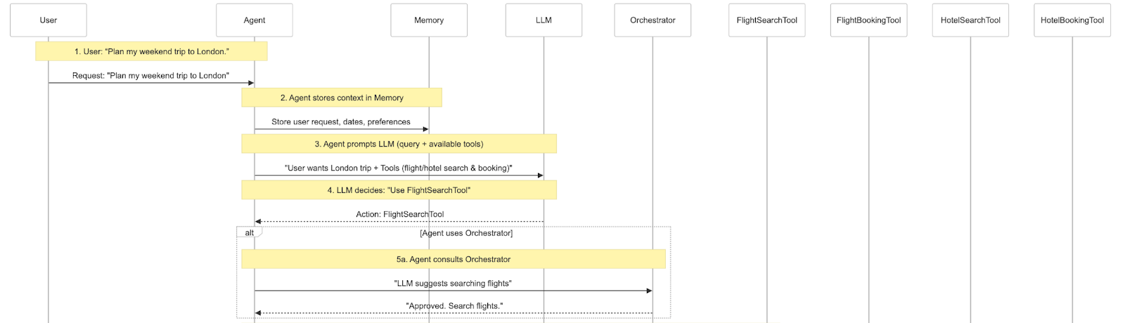 What would it look like if the agent was tasked with planning a weekend trip? A very simplified flow could look like this: