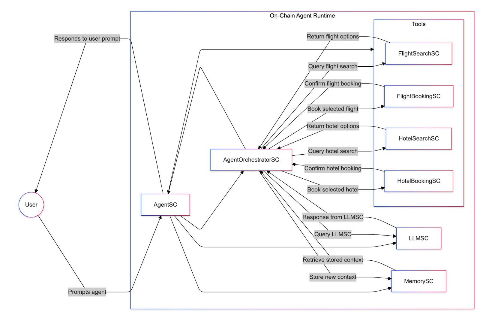 - The AgentSC is the entry point that encapsulates the components (Orchestrator, Memory, LLM, Tools) as modular, composable smart contracts. As better orchestrators, LLMs, and tools come to market, the agent developer (and probably soon the agent itself) can swap out whichever components it wants. But the onchain nature of these modules would mean the agent will always have access to that functioning module.