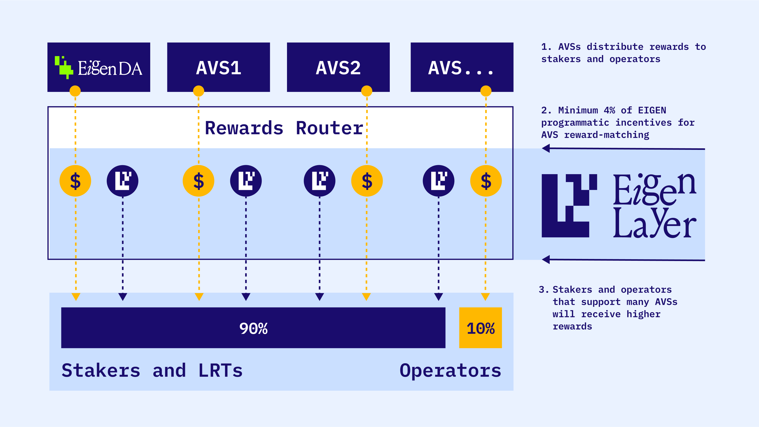 - Stakers and operators that support more AVSs will tend to receive more EIGEN programmatic emissions.