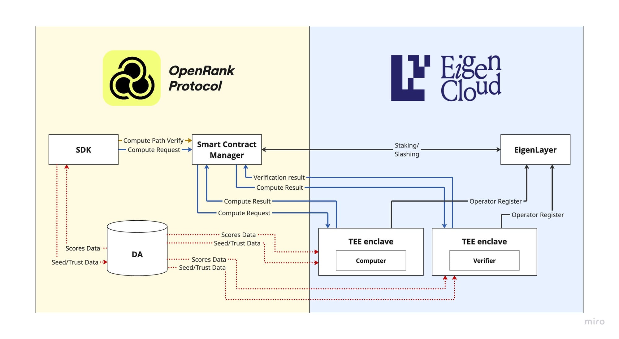 - Architecture - Inputs (“seed/trust” data) and outputs (scores) are stored on a data‑availability layer; developers interact through the OpenRank SDK; a Smart Contract Manager coordinates jobs. Compute runs in two TEE enclaves—a Computer that executes, and a Verifier that independently checks—while EigenLayer supplies restaked collateral for slashing.