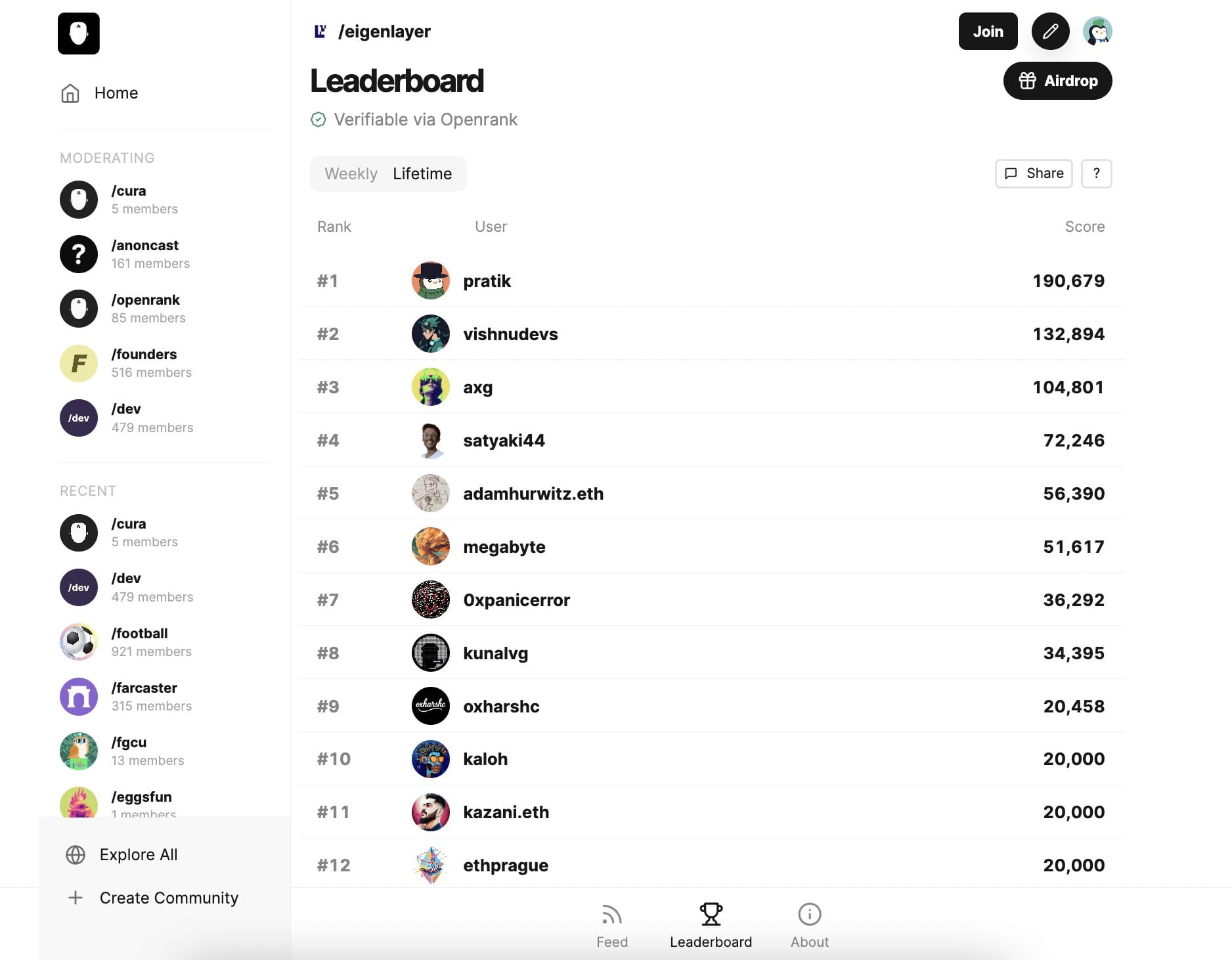 OpenRank computes the scores that power a verifiable feed and a weekly contributor leaderboard; EigenCloud ensures each run is provably correct, challengeable, and economically enforced. Distributing weekly rewards stops being a spreadsheet exercise and becomes a public, auditable ceremony.